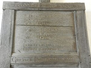 A pair of wooden oak panels are displayed inside the porch of St Mary’s Church. Unlike most memorials for the Great War, these simple wooden panels were created, and had many of the names (but not all) of the fallen carved upon them, while the war was still in progress. The materials, probably bog oak, were provided by Sir Charles Jessel of Ladham House, and the panels were made and installed by the local building firm of Davis & Leaney, who also mounted a cross on the top of each one.